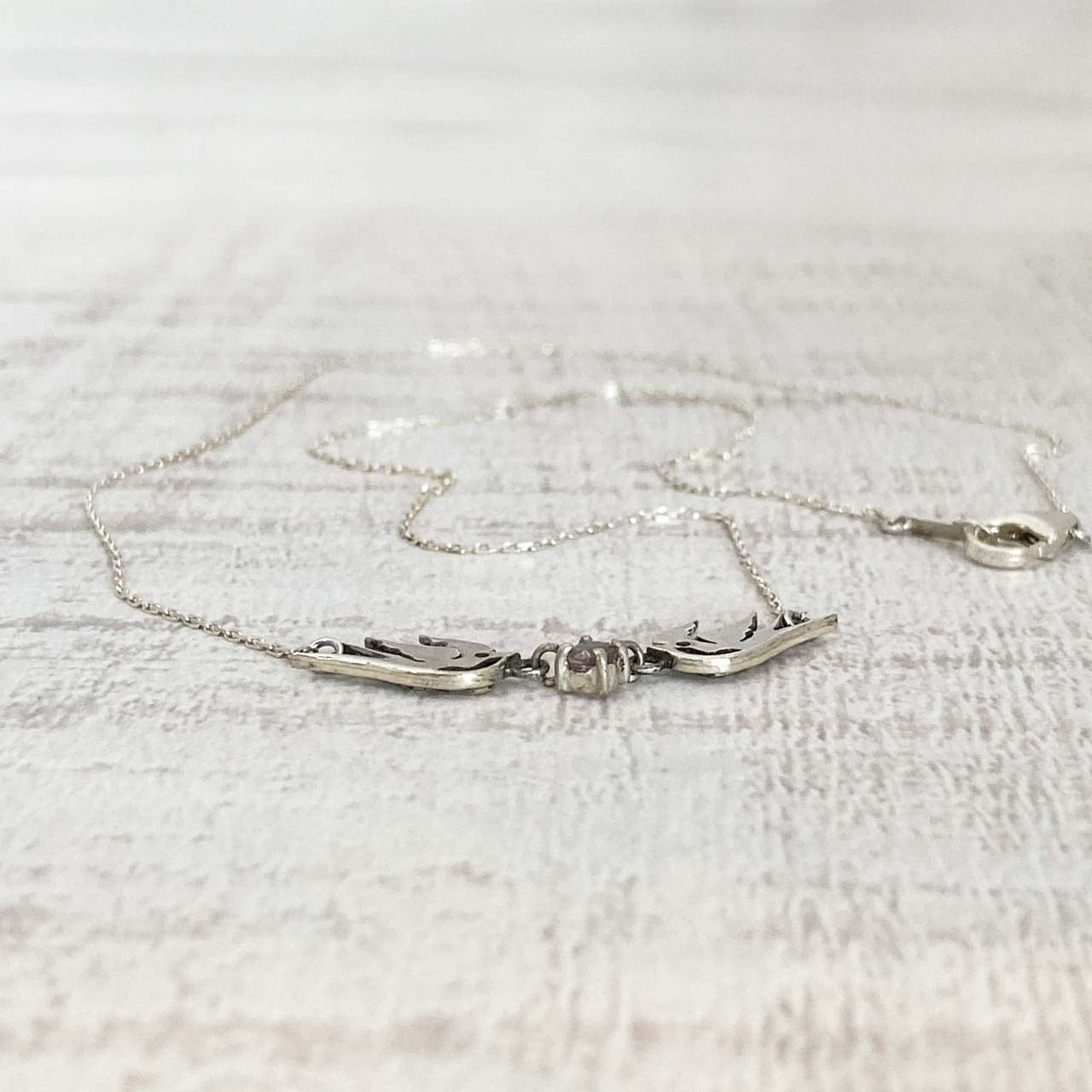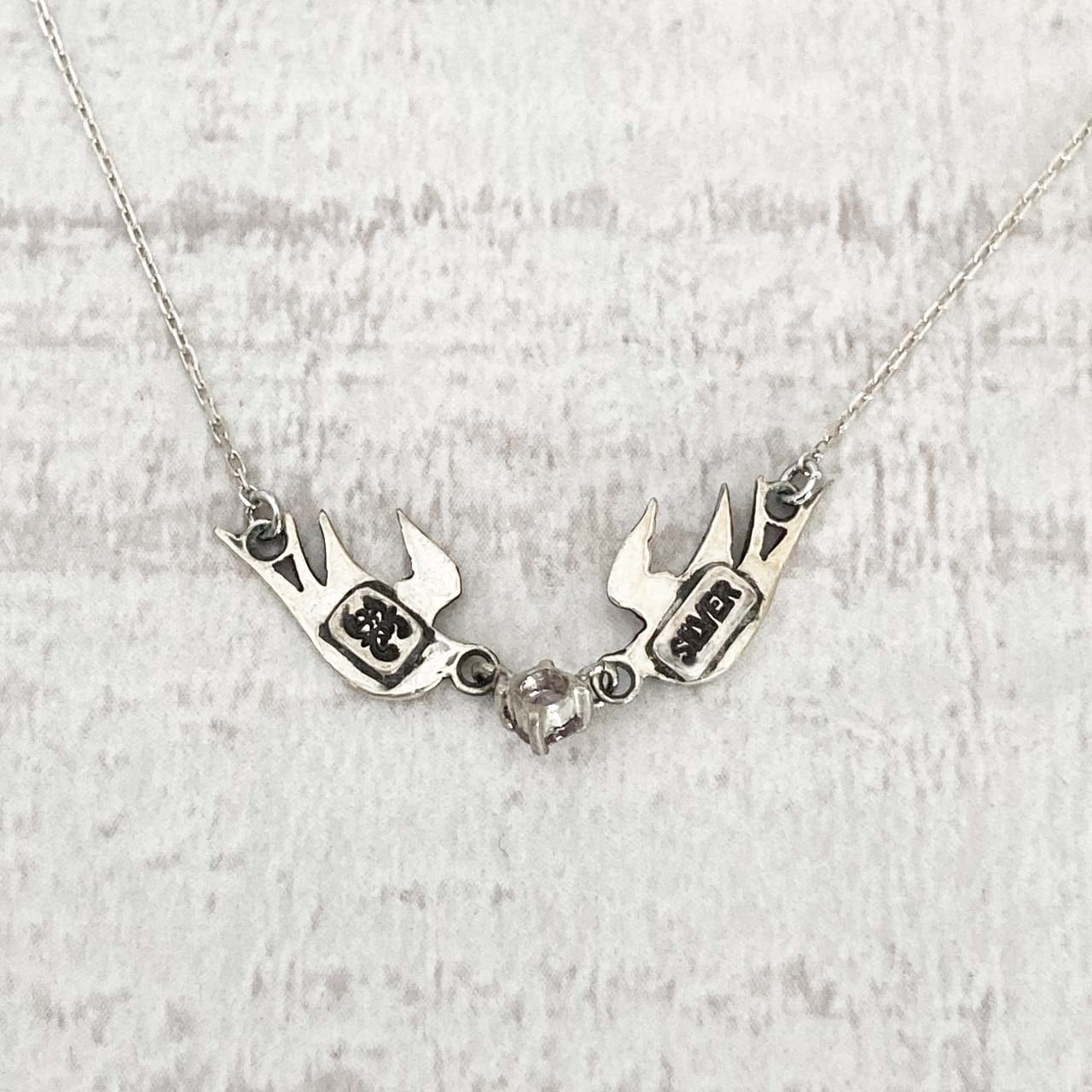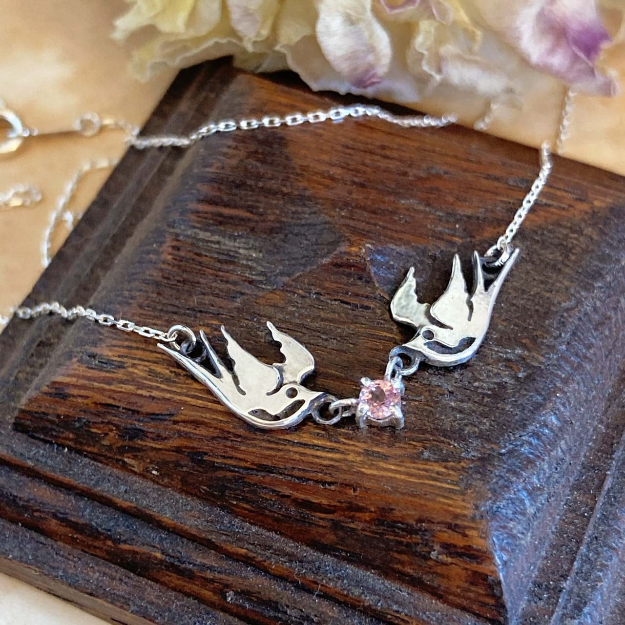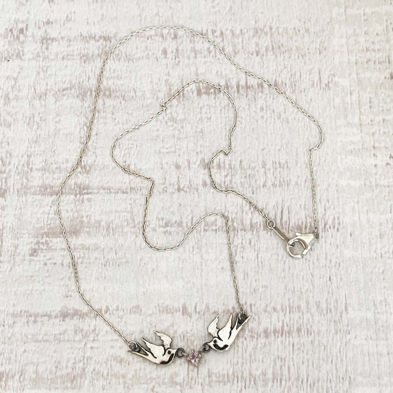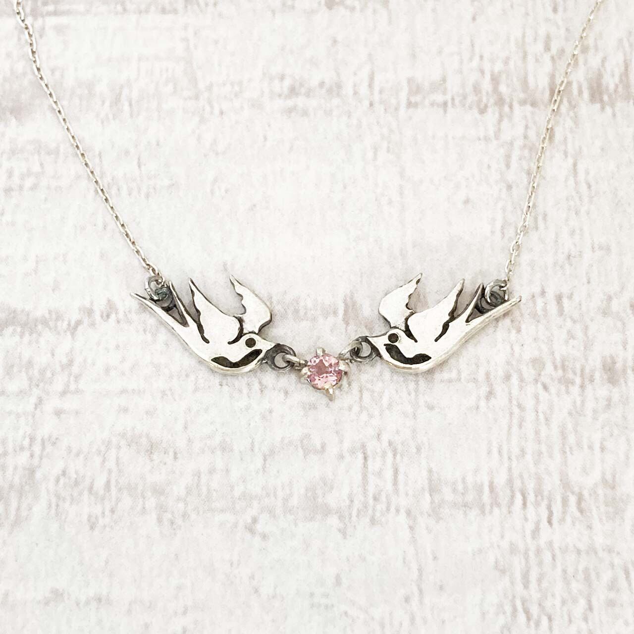 美しいデザインの二羽のツバメが向かい合い、ピンクトルマリンを挟んだペンダントです。